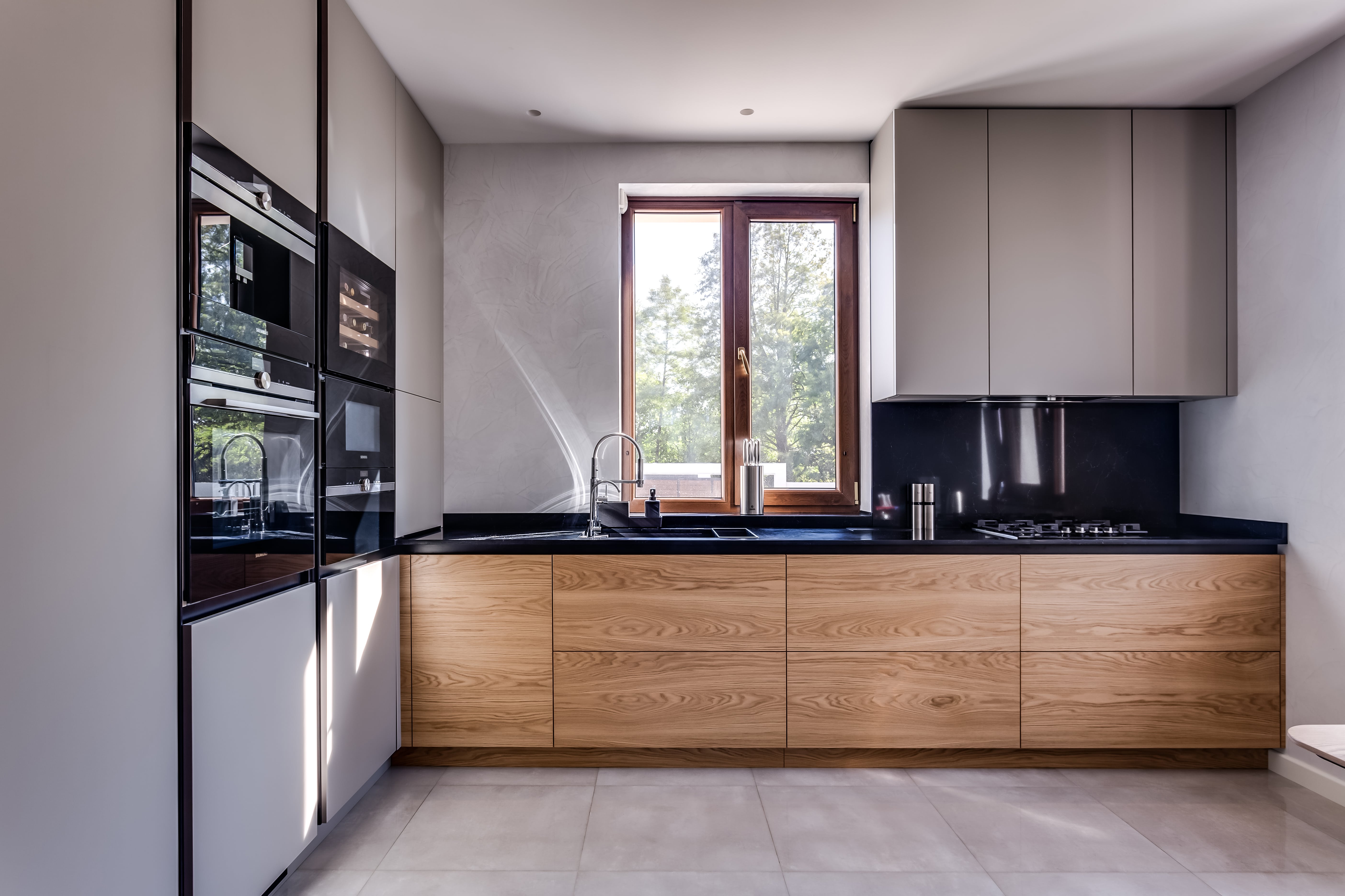 Не забувайте про мінімалізм — чим менше зайвих деталей, тим просторішою здається кухня. Вбудовані ручки, прості геометричні форми, однакова текстура — усе це працює на єдиний візуальний образ.