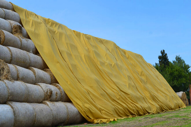Водонепроникною агротканиною покривають скирти сіна або соломи. Це чохол, який ідеально захищає їх від дощу та вітру. Крім того, агротекстиль стійкий до УФ-променів і пропускає повітря, завдяки чому, на відміну від усіляких плівок і брезентів, запобігає утворенню цвілі. Варто підкреслити, що агроволокно для соломи чи сіна менш чутливе до вітру, ніж плівка чи брезент, тому забезпечує більшу міцність. Через це агротканина для покриття тюків сіна або соломи є справді кращим рішенням у господарстві.