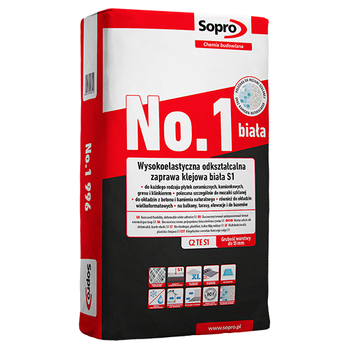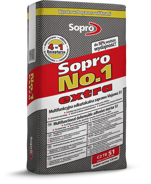 Клей Sopro NO.1 400 EX – багатофункціональна високо еластична клейова суміш, що виготовляється на цементній основі. Ця суміш може використовуватися для облицювання різних поверхонь керамічною плиткою та природнім камінням, яке має високий рівень стійкості до фарбування. Виробники рекомендують використовувати такий клей для облицювання басейнів, терас, фундаментів. Також він відмінно підійде для укладання на стіни та підлогу с підігрівом. Можливо також використання такого клею для укладання облицювального матеріалу на вже існуючий методом «плитка на плитку».