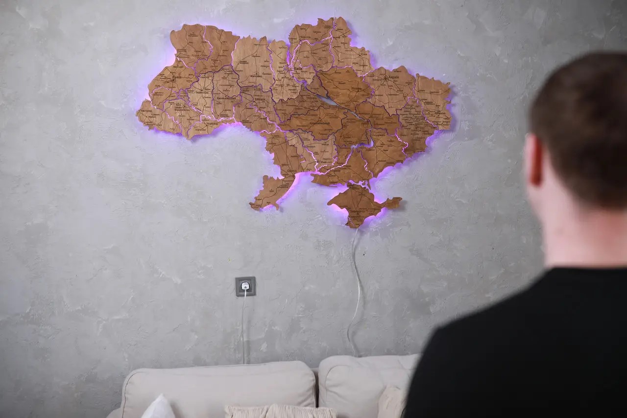 Дерев'яні карти світу або окремої країни – це унікальні та красиві витвори мистецтва, що поєднують у собі функціональність карти з природною красою дерева. Це не тільки практичні інструменти для вивчення географії, а й унікальні декоративні елементи, які нададуть характеру будь-якому інтер'єру. Якщо ви шукаєте сучасну прикрасу для своєї квартири або офісу, дерев'яна карта з підсвічуванням на стіні – унікальне доповнення, яке неодмінно змінить будь-який простір і надасть йому неповторного характеру, справляючи приголомшливе враження на гостей будинку або клієнтів.