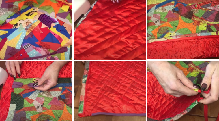 Наступним етапом потрібно скласти деталі разом і обрізати зайве, тим самим підрівняти. Беремо відповідну тасьму або стрічку з тканини і робимо окантування деталей. На меншій стороні робимо загин і прострочуємо на двох деталях – цей заворот ми використовуємо для втягування шнура. Зробимо з двох клаптів розміром 5х8 см дві петельки і вкладемо між полотнами, попередньо прихопивши до одного з них.