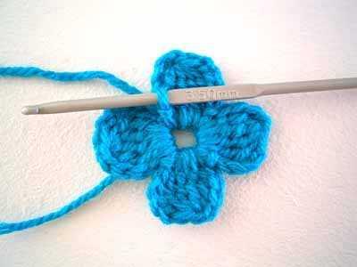 - В'яжемо 3 повітряних петлі і стовпчиком без накиду з'єднуємо їх з центральним кільцем, з якого починали роботу. Отримуємо 1 пелюстку майбутньої квітки з 4 таких же пелюсток.