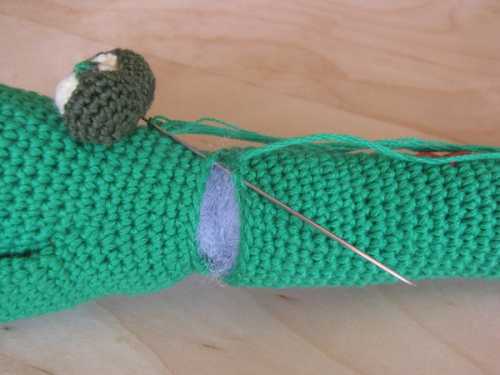 У тулуб вставляємо дротяний каркас, обгорнутий пластиром, і обережно додаємо наповнювач, рівномірно розподіляючи його по всій довжині тулуба за допомогою гачка для в'язання.