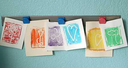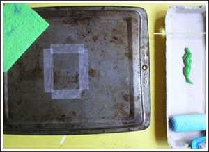 Є ще одна цікава ідея, пов'язана з відбитками. Але для її виконання вам знадобиться поверхню, яка не вбирає фарбу, наприклад, деко. Під розмір листівки, за допомогою скотча або ізоляційної стрічки позначте на ньому прямокутну рамку.