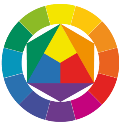 При комбінуванні трьох кольорів основний колір поєднується з третинними кольорами по обидва боки протилежного кольору, наприклад, жовтий + блакитно-фіолетовий + червоно-фіолетовий.