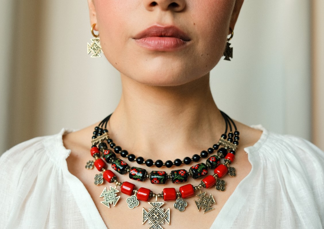 Майстри Oksana Boriychuk створили колекцію, де червоні маки символізують не лише красу, але й незламність духу. Намиста і сережки поєднують авторську кераміку з металевими деталями, зберігаючи виразність квіткових мотивів.