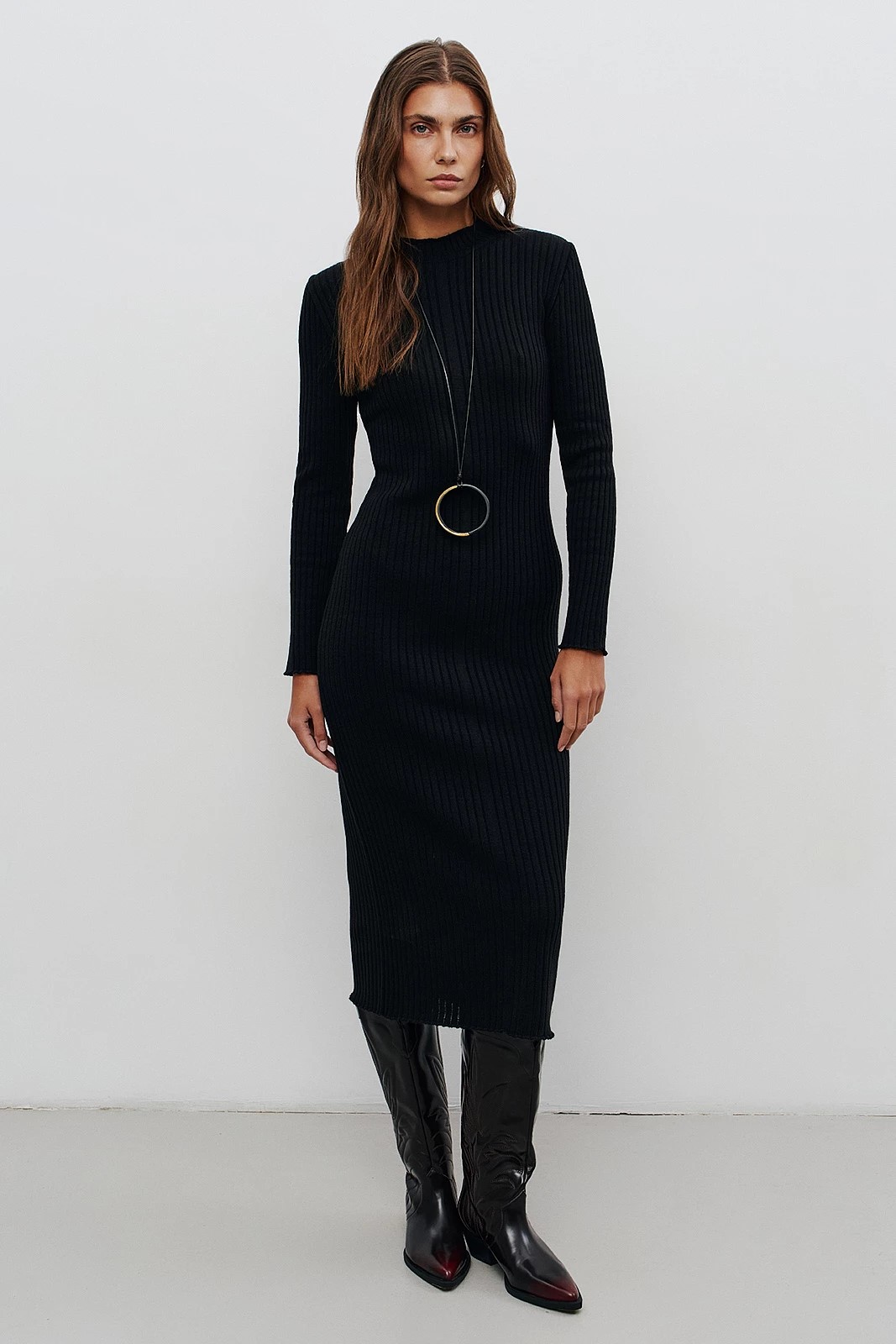 - Трикотажна сукня міді – комфортна і практична, підходить для прохолодних днів. Добре поєднується з грубими черевиками чи ботильйонами.