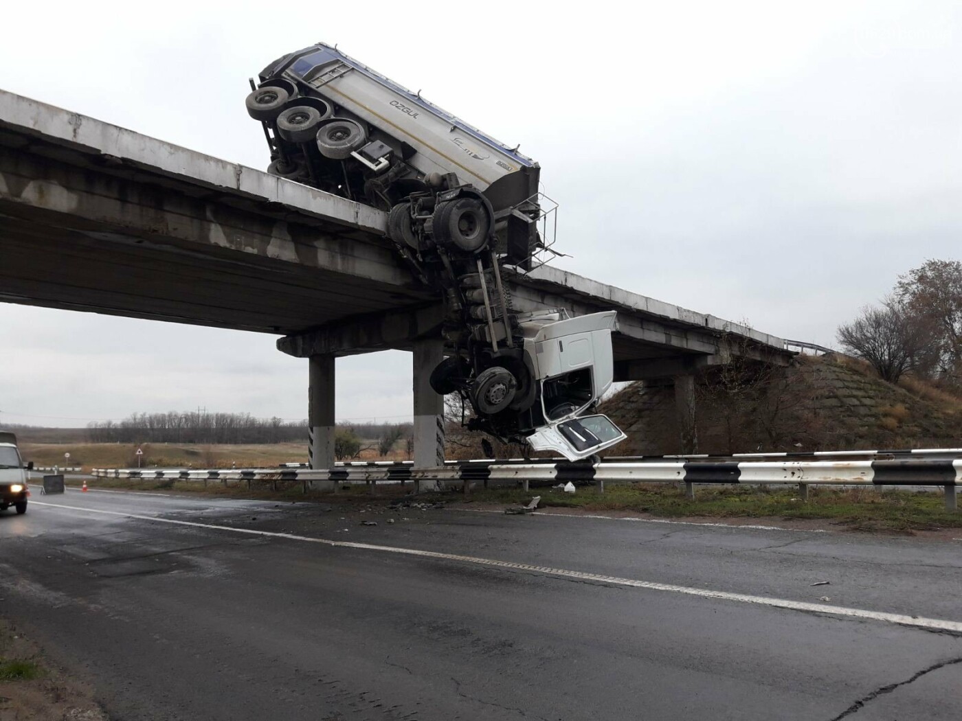 Вантажний автомобіль завис на мосту. Водій в аварії не постраждав.