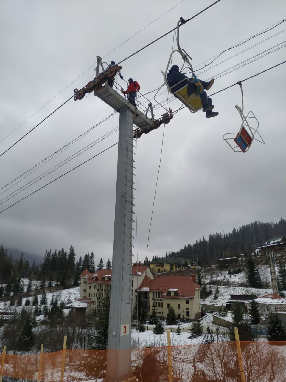 О 10:35 всіх 14 осіб з крісельного підйомника зняли, медичної допомоги ніхто не потребував. Роботи завершено.
