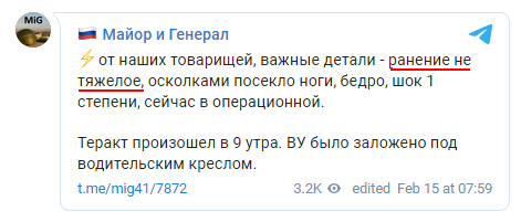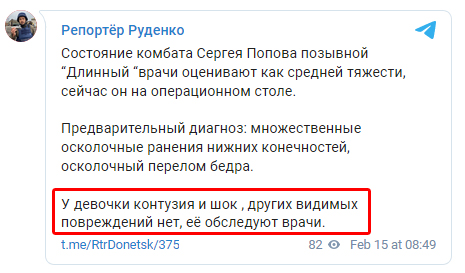 Обидва постраждалих були госпіталізовані. Як повідомили підконтрольні окупантам Телеграм-канали, Попову посікло ноги і стегно, діагностований шок 1-го ступеня. У дочки терориста - контузія і шок.