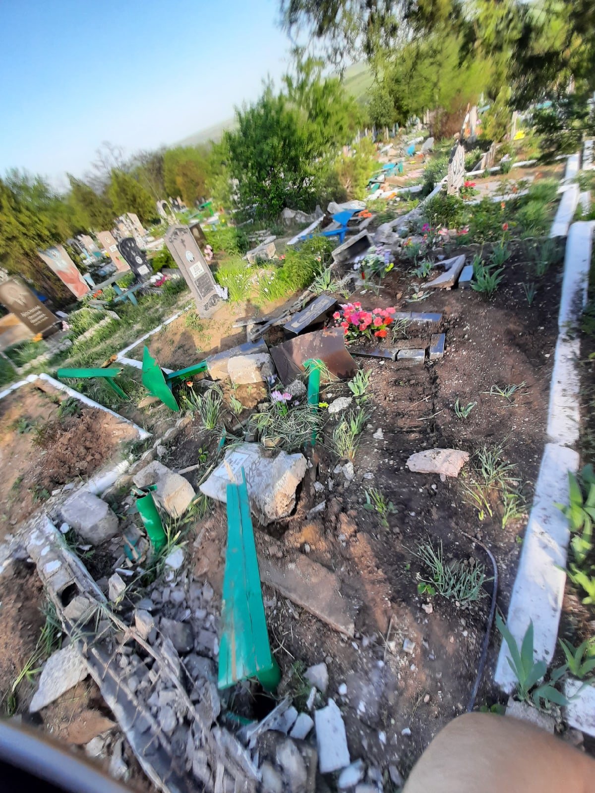 За словами місцевих, поруч із цвинтарем бойовики влаштували полігон. Спеціально для військової техніки проклали ґрунтову дорогу, але члени незаконних формувань продовжують їздити по асфальтованій дорозі, з якої і вилетіли на кладовище.