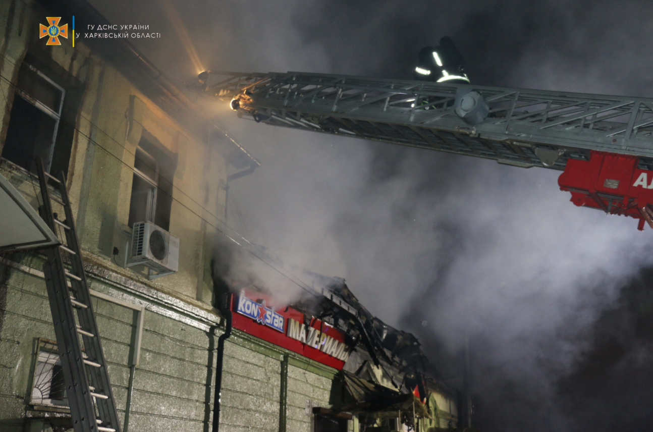 У Харкові в ніч на 25 грудня сталася масштабна пожежа у двоповерховій будівлі з офісами, складами та магазинами. Рятувальники боролися з вогнем всю ніч.