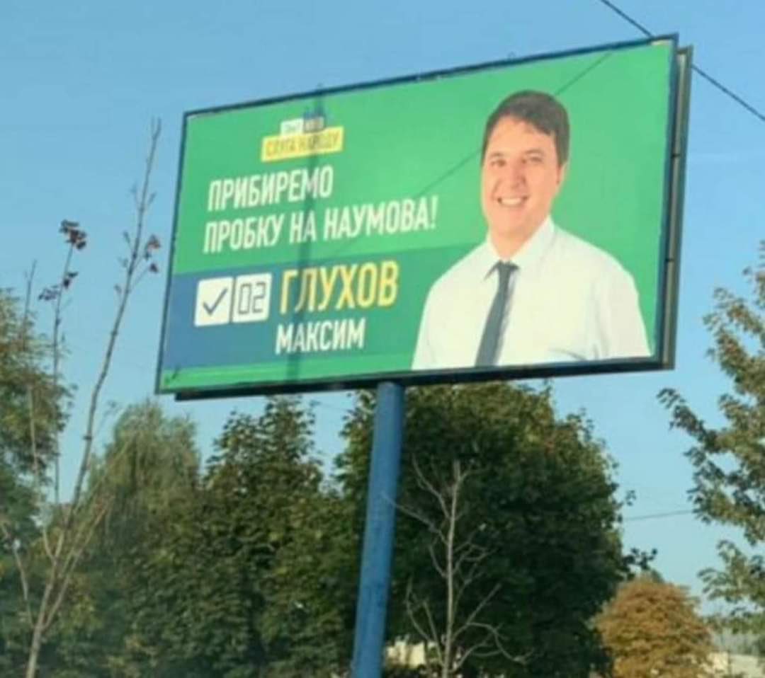 Агітаційний білборд кандидата в депутати Київради Максима Глухова також не відповідає нормам української мови. Правильно було б: "Приберемо затор на Наумова".