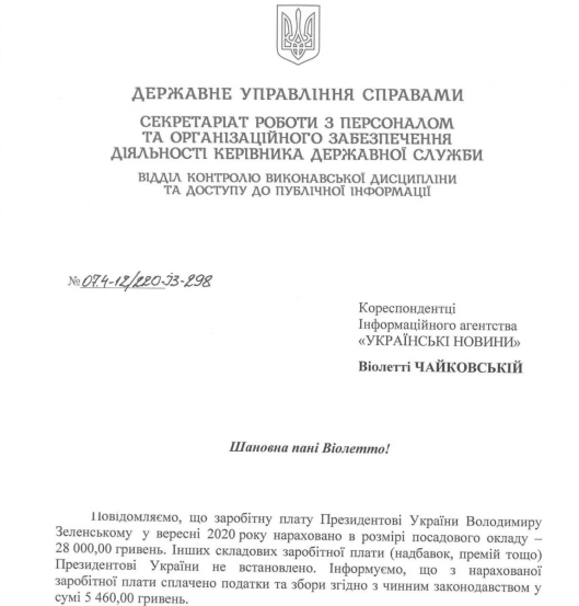 "Заробітну плату президенту України Володимиру Зеленському у вересні 2020 року нараховано в розмірі посадового окладу - 28 000 гривень. Інших складових заробітної плати (надбавок, премій тощо) президенту України не встановлено", - йдеться в документі.