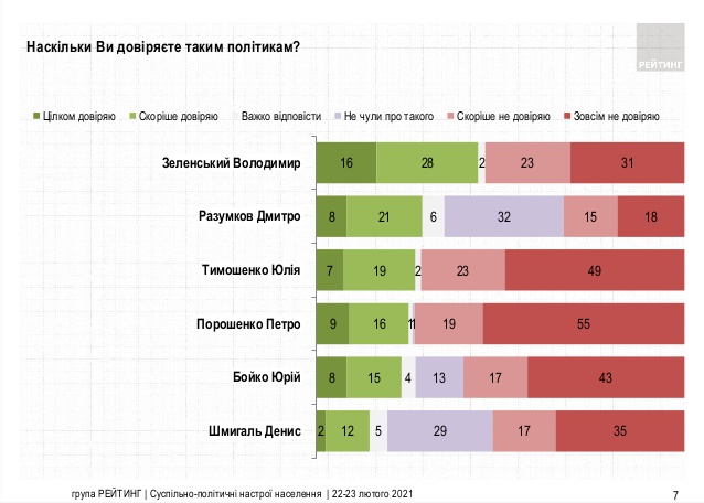 Опитування показало, що найбільше українців довіряє президенту Володимиру Зеленському - 44%, не довіряють - 54%. Порівняно з січнем рівень довіри до президента зріс з 37 до 44%.
