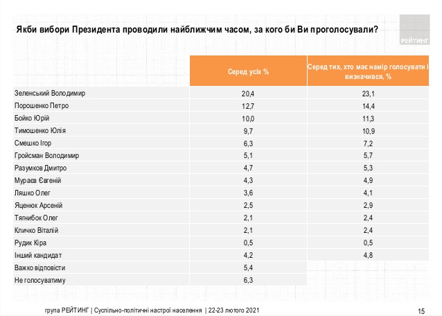 За П.Порошенка проголосували б 14,4%, Ю.Бойка - 11,3%, Ю.Тимошенко - 10,9%. І.Смешка підтримують 7,2%, В.Гройсмана - 5,7%, Д.Разумкова - 5,3%, Є.Мураєва - 4,9%, О.Ляшка - 4,1%, А.Яценюка - 2,9%, О.Тягнибока та В.Кличка - по 2,4%.