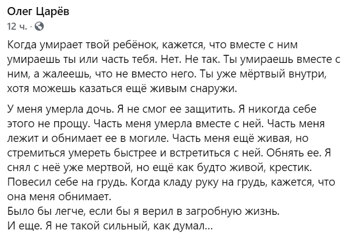 Колишній депутат "Партії регіонів", один з головних ідеологів створення псевдореспублік на Донбасі Олег Царьов повідомив про смерть своєї дочки Катерини.