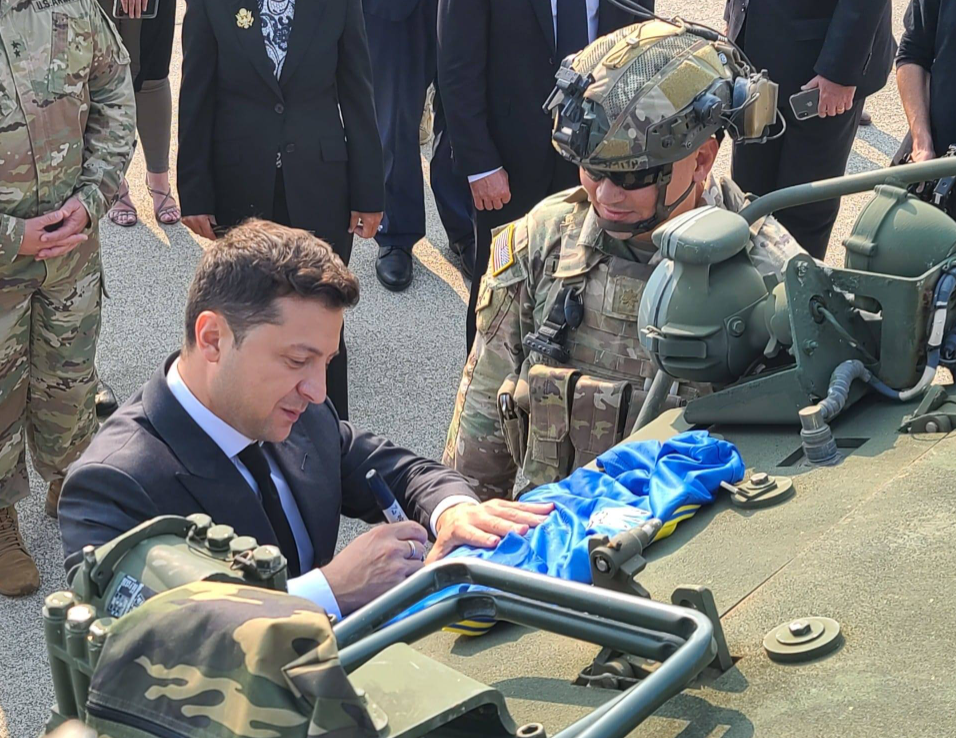 "Під час огляду військової техніки Володимир Зеленський підписав футболку національної збірної України з футболу на прохання майора Національної гвардії Каліфорнії. Гвардієць має українське походження, народився в Лисичанську, є напівкараїмом", - йдеться в повідомленні ОПУ .