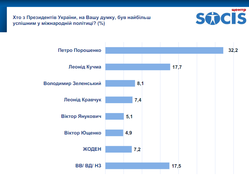 Серед президентів України найбільш успішним у міжнародній політиці 32,2% опитаних вважають Петра Порошенка. На другому місці Леонід Кучма (17,7%), нинішній лідер держави Володимир Зеленський - на третьому місці (8,1%).