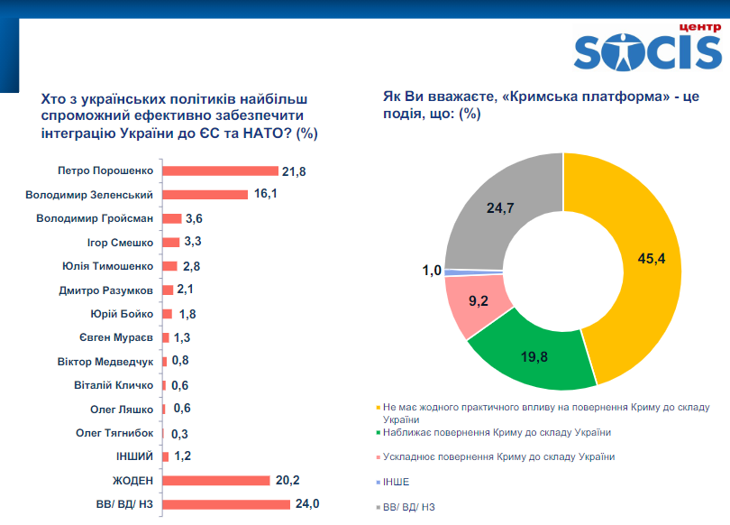 21,8% респондентів вважають, що Порошенко найбільш спроможний ефективно забезпечити інтеграцію України в ЄС і НАТО. 16,1% опитаних вважають таким Зеленського.