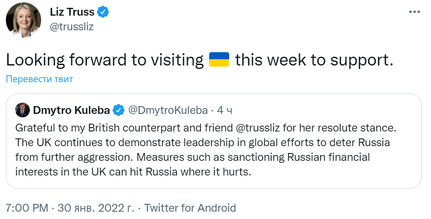 Про це Трасс заявила в Твіттері, прокоментувавши публікацію глави МЗС України Дмитра Кулеби, передає Час Пік.