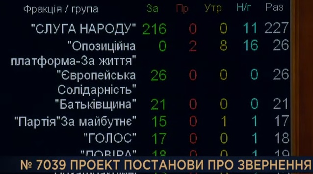 За відповідне рішення проголосували 326 народних депутатів. Жодного голосу не дала лише фракція "ОПЗЖ", передає Час Пік.