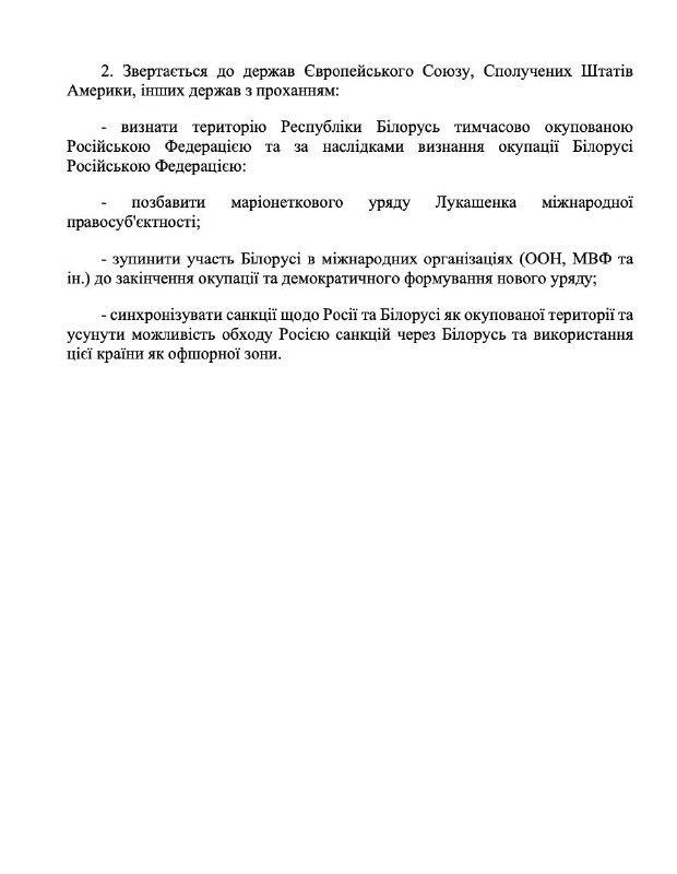 - звернення до міжнародного співтовариства з проханням визнати територію Білорусі тимчасово окупованою Росією;