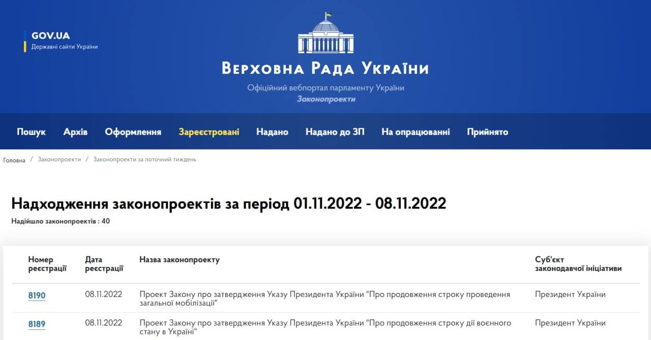 Відповідні законопроєкти про затвердження указів президента України "Про продовження терміну дії воєнного стану в Україні" №8189 та "Про продовження терміну проведення спільної мобілізації" №8190 зареєстровано у парламенті.