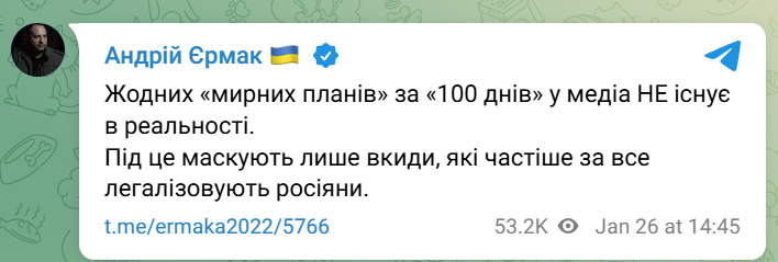 "Жодних "мирних планів" за "100 днів" у медіа не існує в реальності. Під це маскують лише вкидання, які найчастіше легалізують росіяни", - заявив Єрмак.