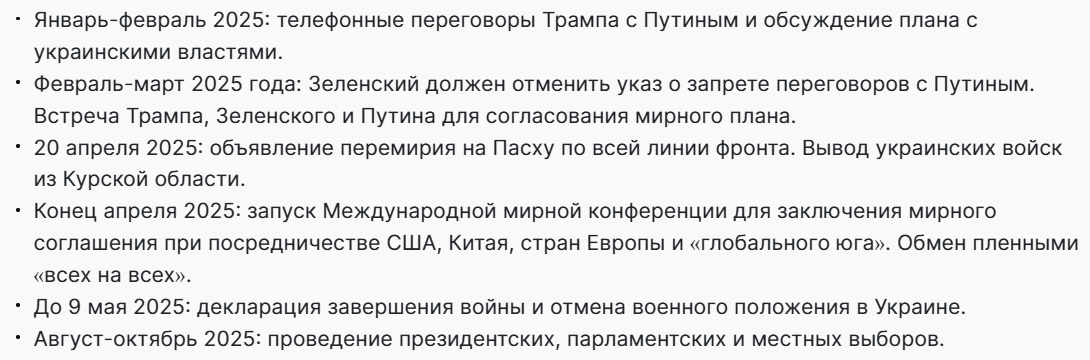 Раніше в мережі з'явилася інформація про нібито переданий Україні "100-денний план" Дональда Трампа, який передбачає закінчення війни до 9 травня 2025 року. Відповідно до цього плану:
