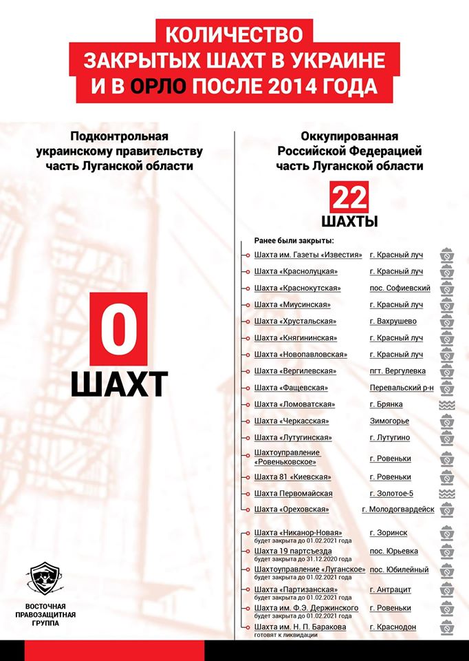 Натомість в ОРЛО припинили свою роботу 22 шахти в населених пунктах Красний Луч, Вахрушеве, Брянка, Лутугине, Ровеньки, Зоринськ, Антрацит, Краснодон та ін.