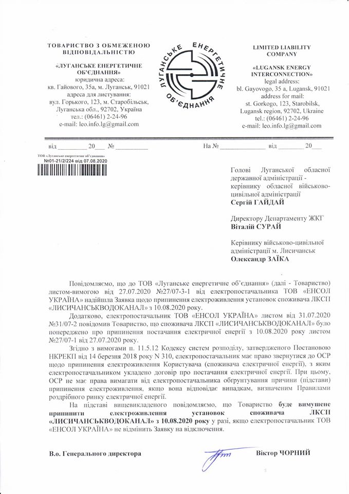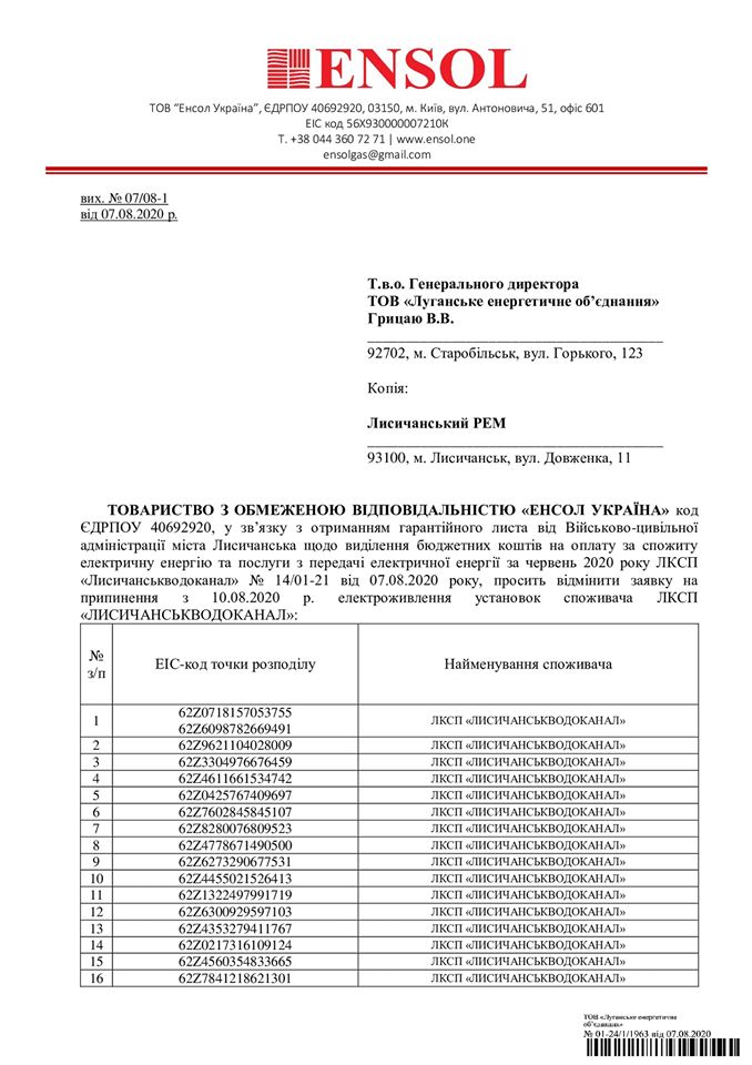Зазначається, что ТОВ "Енсол Україна" відмінило свою заявку на припинення з 10.08.2020 р. електроживлення установок споживача "Лисичанськводоканал" у зв’язку з отриманням гарантійного листа від Військово-цивільної адміністрації міста Лисичанська щодо виділення бюджетних коштів на оплату за спожиту електричну енергію та послуги з передачі електричної енергії.