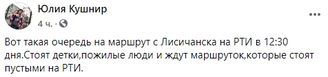 "Ось така черга на маршрут з Лисичанська на ГТВ о 12:30 дня. Стоять дітки, літні люди і чекають маршруток, які стоять порожніми на ГТВ", - пише автор поста.