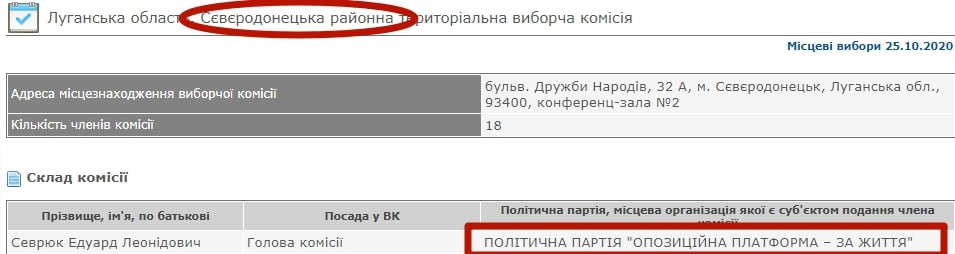 Згідно з інформацією на сайті ЦВК, головою Сєвєродонецької районної територіальної виборчої комісії є член ОПЗЖ Севрюк Едуард Леонідович, Сєвєродонецьку міську ТВК Сєверодонецького району очолює член ОПЗЖ Фомберг Олександр Олександрович, Лисичанську міську ТВК Сєверодонецького району - член ОПЗЖ Бєлуха Максим Борисович, Рубіжанську ТВК Сєверодонецького району - член ОПЗЖ Громова Іна Василівна.