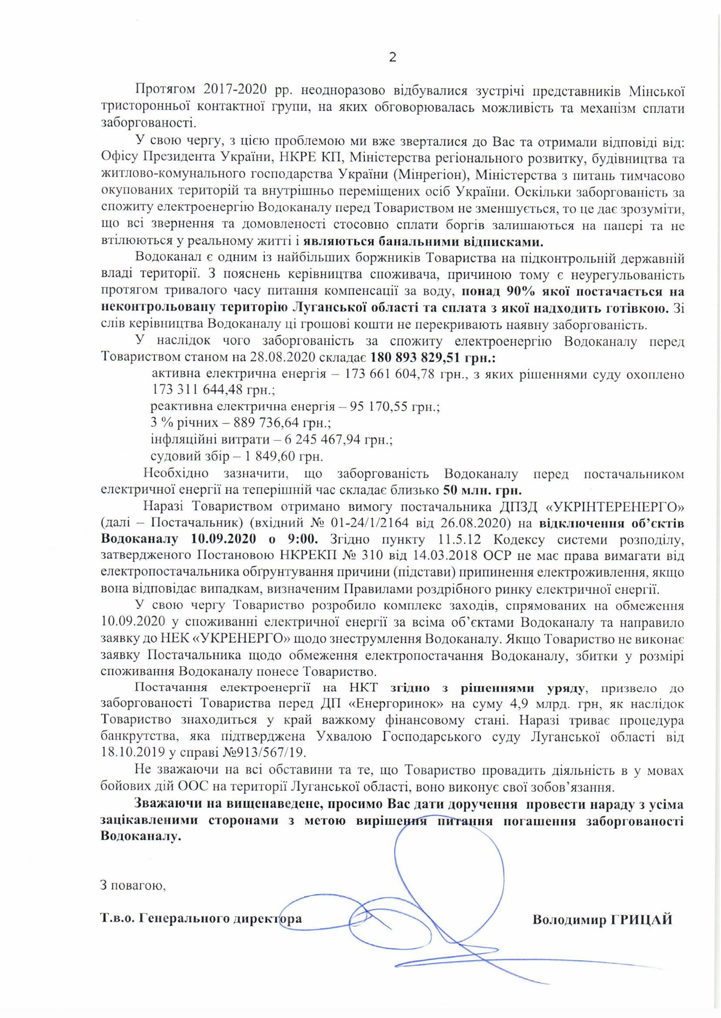 У товаристві заявили, що станом на 28.08.2020 року борг КП "Попаснянський районний водоканал" перед ЛЕО складає 180 893 829,51 грн. Також утворилася заборгованість й перед постачальником електричної енергії - 50 млн грн.