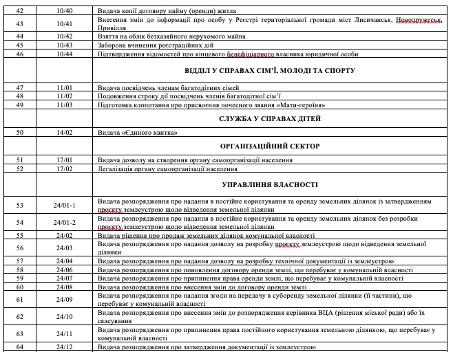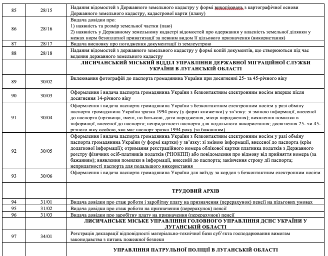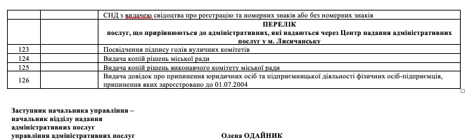 Відповідне розпорядження "Про затвердження Переліку адміністративних послуг, які надаються через Центр надання адміністративних послуг у м.Лисичанськ" було оприлюднено 29 вересня поточного року, передає Час Пік з посиланням на офіційний портал ВЦА.