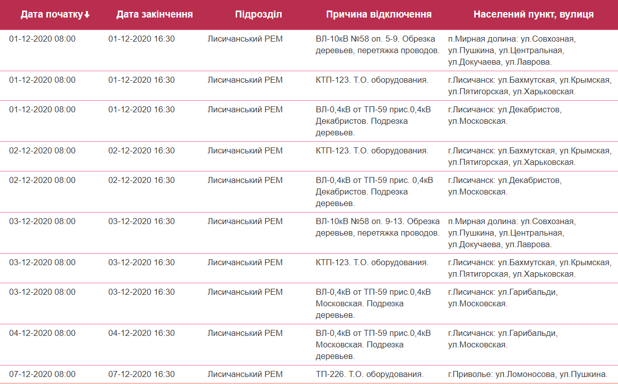 ТОВ "Луганське енергетичне об'єднання" оприлюднило на своєму сайті графік планових відключень на грудень 2020 року, передає Час Пік.