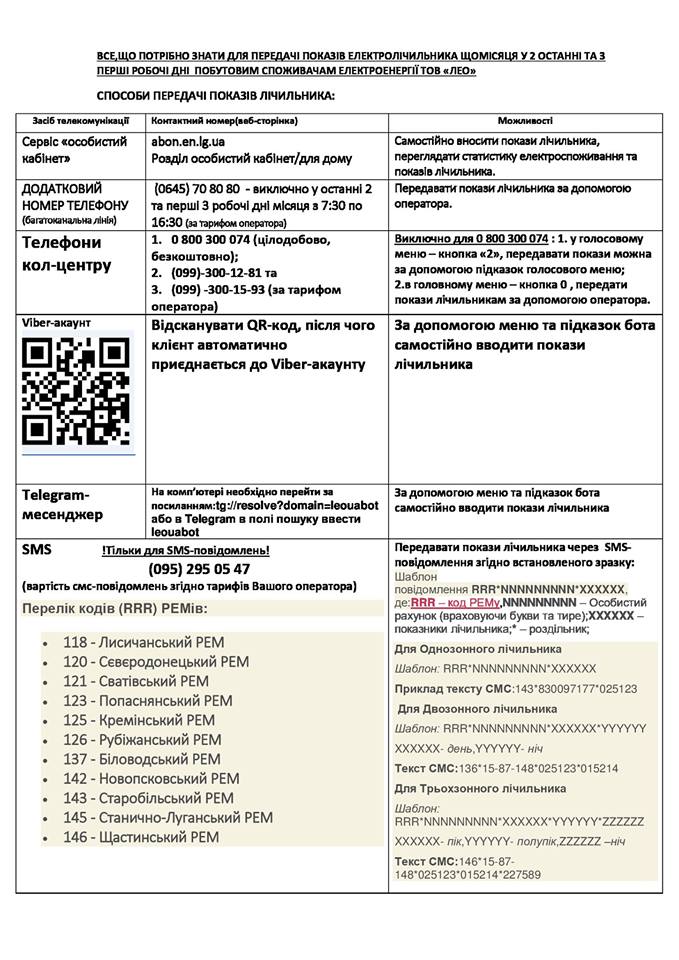 Передати показання лічильника електроенергії можна декількома способами. Є можливість самостійно внести показання в особистому кабінеті abon.en.lg.ua . Також існує швидкий спосіб внести показання онлайн: для цього потрібно натиснути на кнопку на сайті ЛЕО і у вікні вибрати РЕМ, тип лічильника, ввести номер особового рахунку та показання.