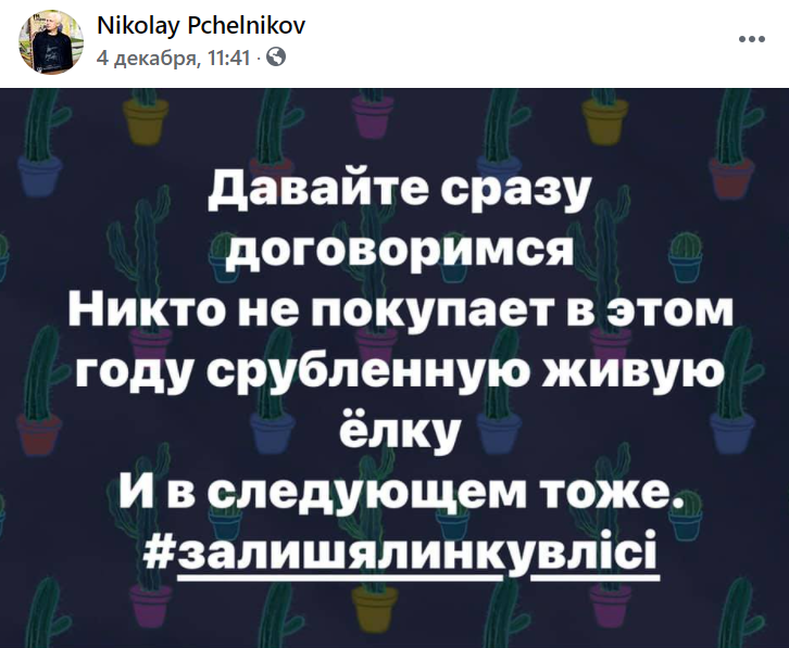 "Справа в тому, що багато новорічних ялинок вирощують фермери спеціально на зріз, і цим страйком ви залишаєте фермерів без заробітку. Це схоже на давайте не будемо купувати хліб - залишимо пшеницю в полі".