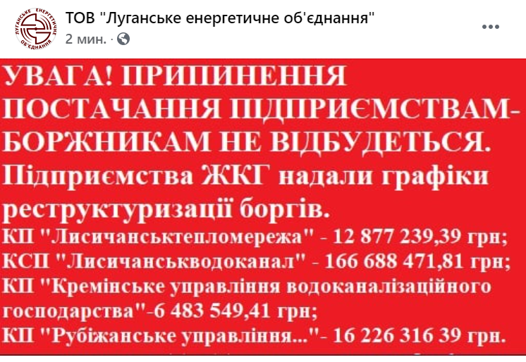 Це сталося після того, як "Луганське енергетичне об'єднання" пообіцяло знеструмити "Лисичанськводоканал" через не надання графіку погашення заборгованості за електроенергію.