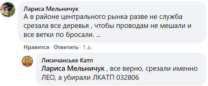 Відомо, що купи зрізаних гілок залишили після себе працівники Луганського енергетичного об'єднання, які проводили обрізку дерев. На захаращення територій місцеві мешканці скаржилися в соцмережах, а вже наступного дня гілки прибрали працівники КАТП.