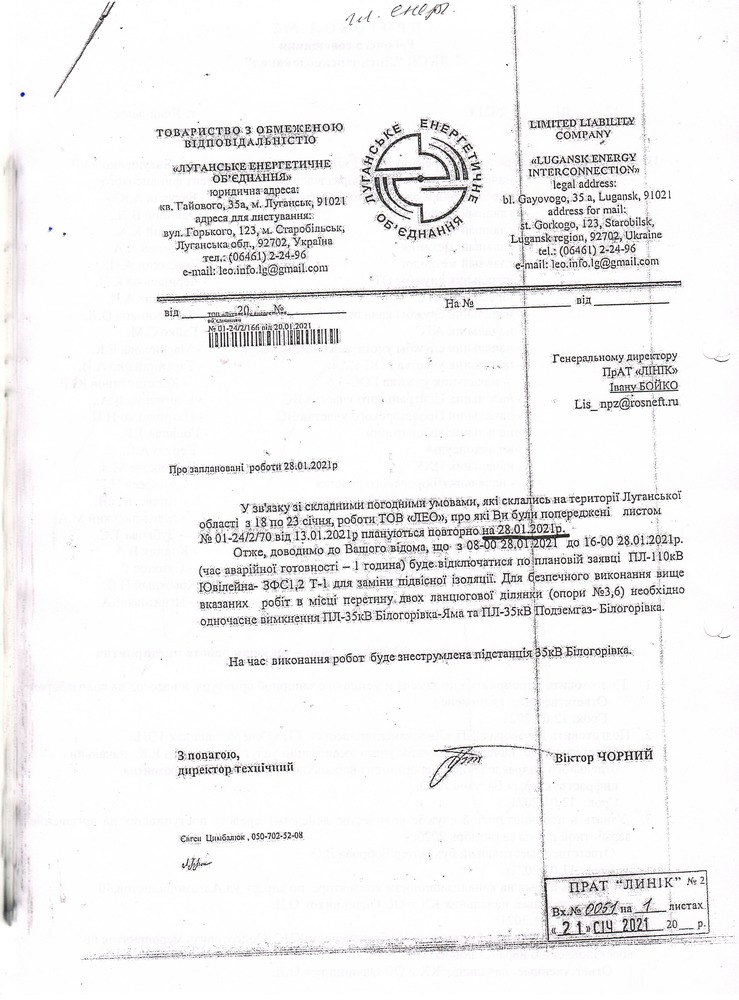 "В зв'язку з проведенням ремонтних робіт на ПЛ-110 кВ та ПЛ-35 кВ ТОВ «ЛЕО» (лист ТОВ «ЛЕО» №01-24/2/166 від 20.01.2021) 28.01.2021 р. з 8.00 до 16.00 буде знеструмлена насосна станція другого підйому ЛКСП «Лисичанськводоканал» «Білогорівська», тому буде припинення водопостачання центральної та північної (район заводу «Пролетарій») частин міста Лисичанськ та міст Новодружеськ, Привілля. Мешканців цих міст просимо зробити дводенний запас води", - йдеться в повідомленні.