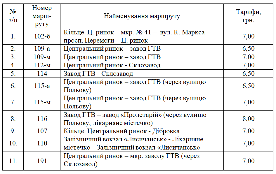 На 11 маршрутах Лисичанська проїзд подорожчає на гривню (дивіться у таблиці нижче). Нові тарифи відрізняються від старих на 1 грн. (таблицю старих тарифів можна подивитись тут).