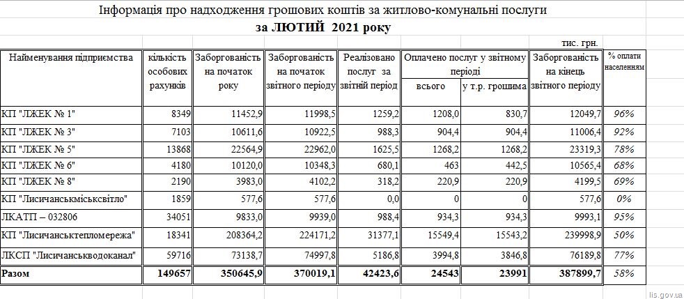 Найкраще платять за надані послуги підприємствам ЛЖЕК №1, ЛЖЕК №3, а також ЛКАТП 032806 - в них оплата населення складає більше 90%. Послуги КП "Лисичанськтепломережа" оплачуються населенням тільки на 50%, ЛКСП "Лисичанськводоканал" - на 77%.