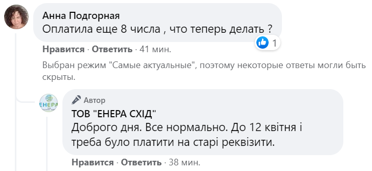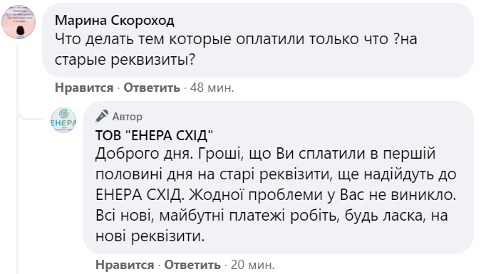 Для тих, хто не знав про зміни і сплатив на старі реквізити, у "Енера Схід" повідомили, що такі платежі, зроблені 12 квітня у першій половині дня, ще надійдуть на рахунки компанії.