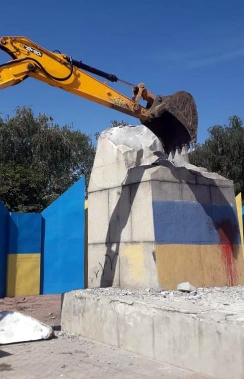 "Завдяки злагодженій роботі всіх служб сьогодні нарешті демонтуються залишки пам'ятника і постамент, загальною вагою понад 100 тонн. Рішення про подальшу долю майданчика, що знаходиться під пам'ятником, буде прийнято згодом", - йдеться в повідомленні ВЦА.