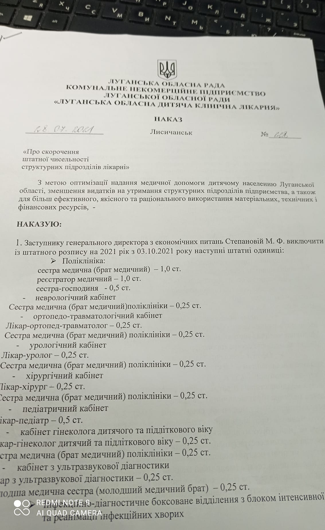 Наказ "Про скорочення штатної чисельності структурних підрозділів лікарні" від 28.07.2021 підписаний Світланою Ошеко, генеральним директором Луганської обласної дитячої клінічної лікарні.