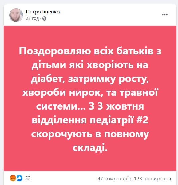 "Вітаю всіх батьків з дітьми які страждають на діабет, затримку росту, хвороби нирок, і травної системи ... З 3 жовтня відділення педіатрії # 2 скорочують в повному складі", - написав Петро Іщенко, завідувач відділення педіатрії №2 Луганської обласної дитячої клінічної лікарні, у своєму акаунті у Фейсбуці. Він також опублікував фото наказу про скорочення штату лікарні.