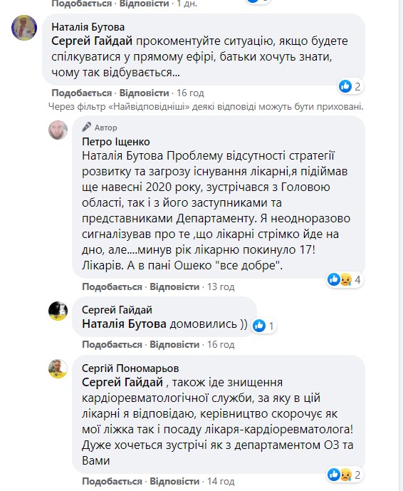 У коментарі до посту Іщенка користувачів Наталія Бутова зазначила Сергія Гайдая, голову ВЦА області, та попросила прокоментувати ситуацію у своєму "прямому ефірі", на що він погодився.