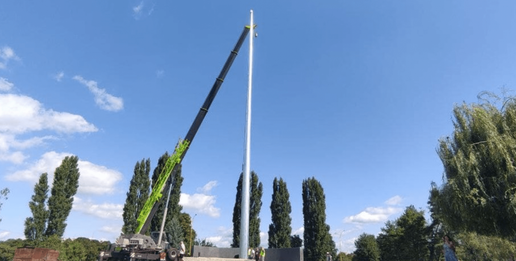 З установкою гігантських флагштоків в Україні не все йде гладко. У Херсоні 70-метрова щогла і зовсім впала, а в Ужгороді флагшток небезпечно нахилився.